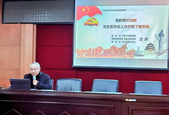 卫洪说,回顾党的百年历程,深深体会到我们党是一个十分注重理论创新的政党。作为一名文艺评论工作组织者、参与者有一个很直观的感受,那就是文艺评论已经成为加强和改进党对文艺工作领导的重要手段,成为党领导文艺工作新的抓手,随着文艺评论工作地位的日益突显,极大地丰富和完善了党领导文艺工作的手段和路径。党的十九届六中全会是一个具有里程碑意义的重要会议,通过的《中共中央关于党的百年奋斗重大成就和历史经验的决议》是我们党的历史上第三个历史决议,是一篇马克思主义的纲领性文献;是新时代中国共产党人牢记初心使命、坚持和发展中国特色社会主义的政治宣言;是以史为鉴、开创未来,实现中华民族伟大复兴的行动指南。六中全会召开后,按照市委宣传部和市文联党组的统一部署,市文艺评论家协会及时行动,全面组织开展十九届六中全会精神的学习、宣传和贯彻活动。一是组织主席团及广大会员认真学习全会精神,撰写短评微评在中国文艺评论网、华龙网等主流媒体上公开发声;二是充分利用会员的创作能力,开展宣传十九届六中全会精神的文艺作品征集活动,在全体会员及全市文艺界征集反映十九届六中全会精神的诗词、楹联、歌词、诗词及相声、小品、三句半、故事脚本,清音、竹琴等群众喜闻乐见的曲艺唱词,为书法、电视、曲艺、戏剧等文艺门类艺术家二度创作提供素材;三是发挥理论优势,组织协会艺术家深入基层,开展十九届六中全会精神微宣讲。